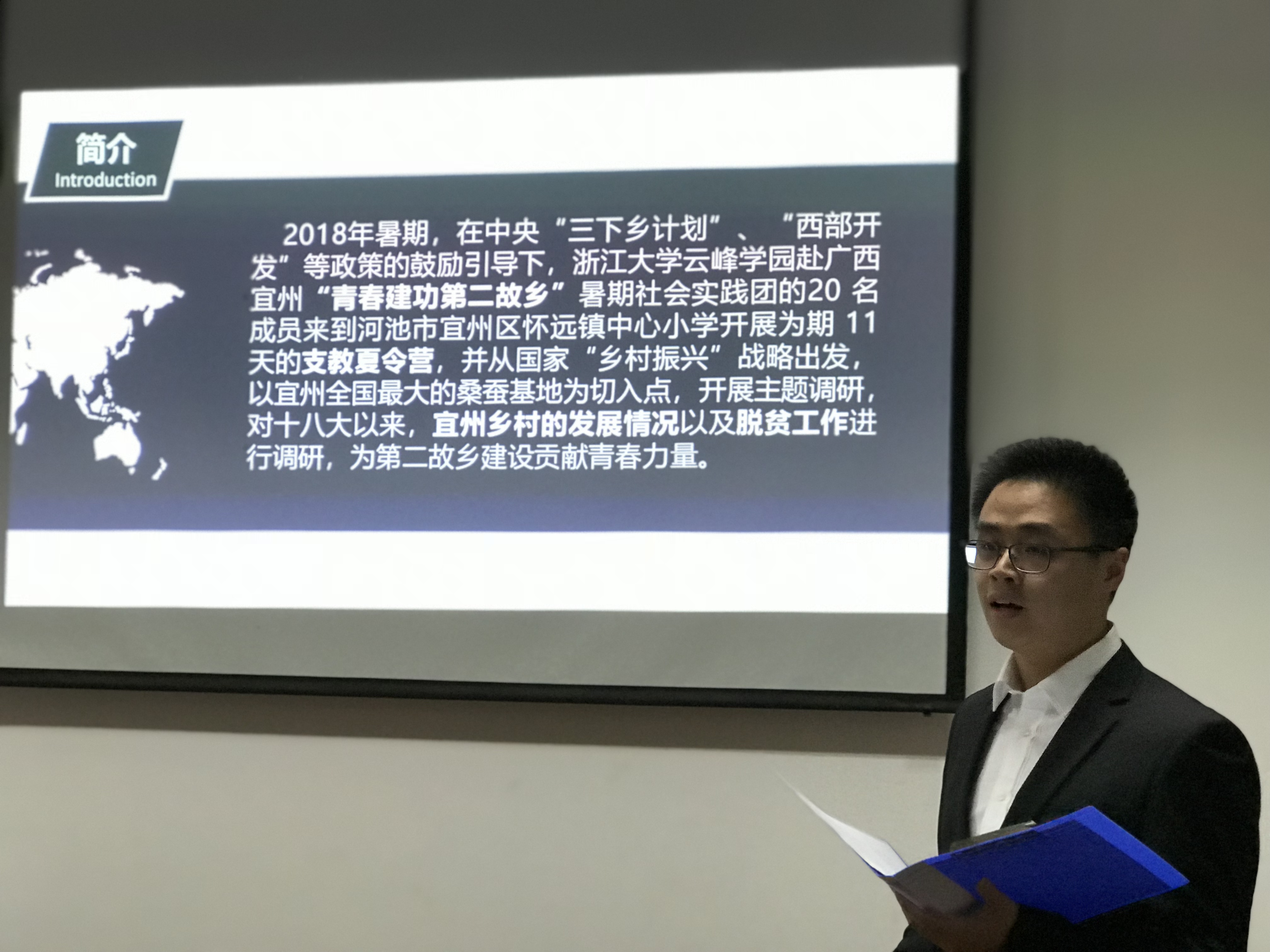 2018年10月12日晚上六点半,云峰分团委社会实践指导中心在碧峰党员之家举行了浙江大学求是学院云峰学园2018年暑期社会实践园优答辩会,云峰学园分团委书记、辅导员刘帅老师,云峰学园分团委副书记、辅导员陶虹向老师、李晓倩老师以及三位分团委挂职副书记担任本次答辩会的评委。