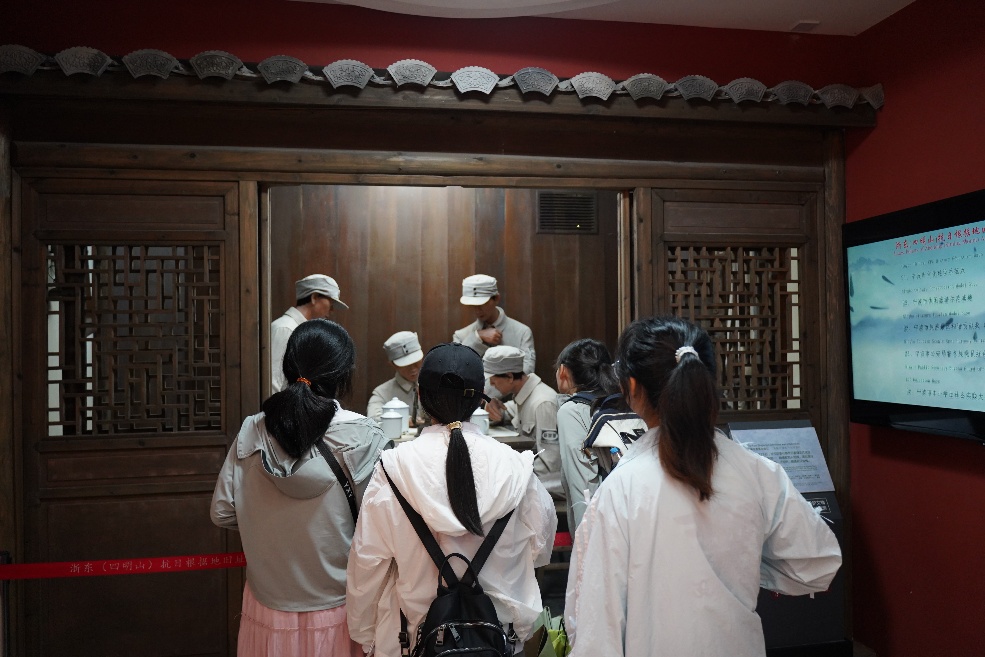 随后我们参观了浙东行政公署旧址。史迹陈列馆中,展品大多一身斑驳油污,几乎辨认不出原本的颜色,展现出抗战时期军民的生活条件之艰苦,也体现出军民同心抗战的坚定决心;原貌布置馆中,一个个活灵活现的蜡人重现了那个时期人们的精神风貌,令人肃然起敬。随后参观的浙东抗日军政干部学校、浙东银行等馆更是让我们体会到了抗战时期这个小小村落内完善的制度与机构,感受到了人们奋发的精神风貌。
